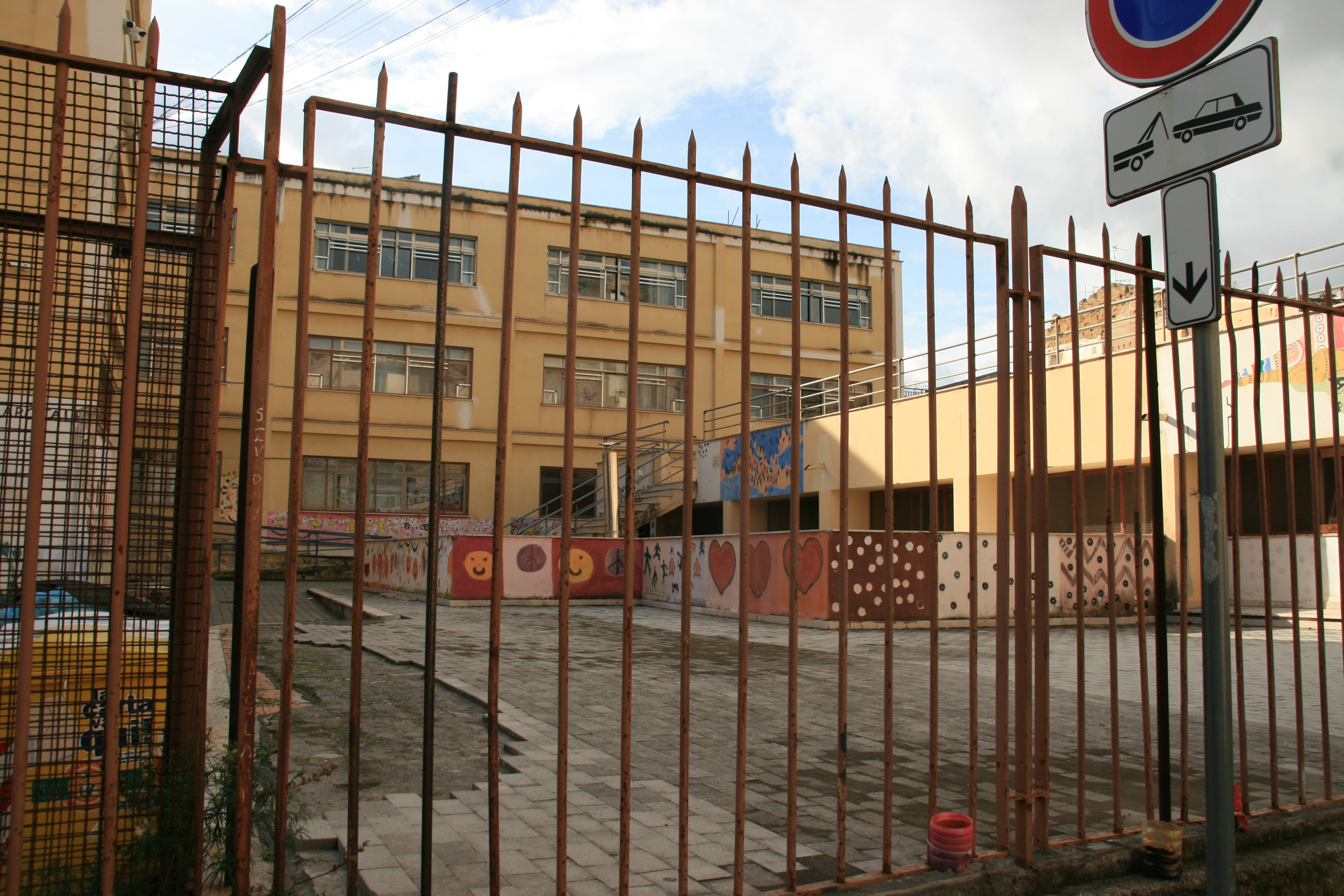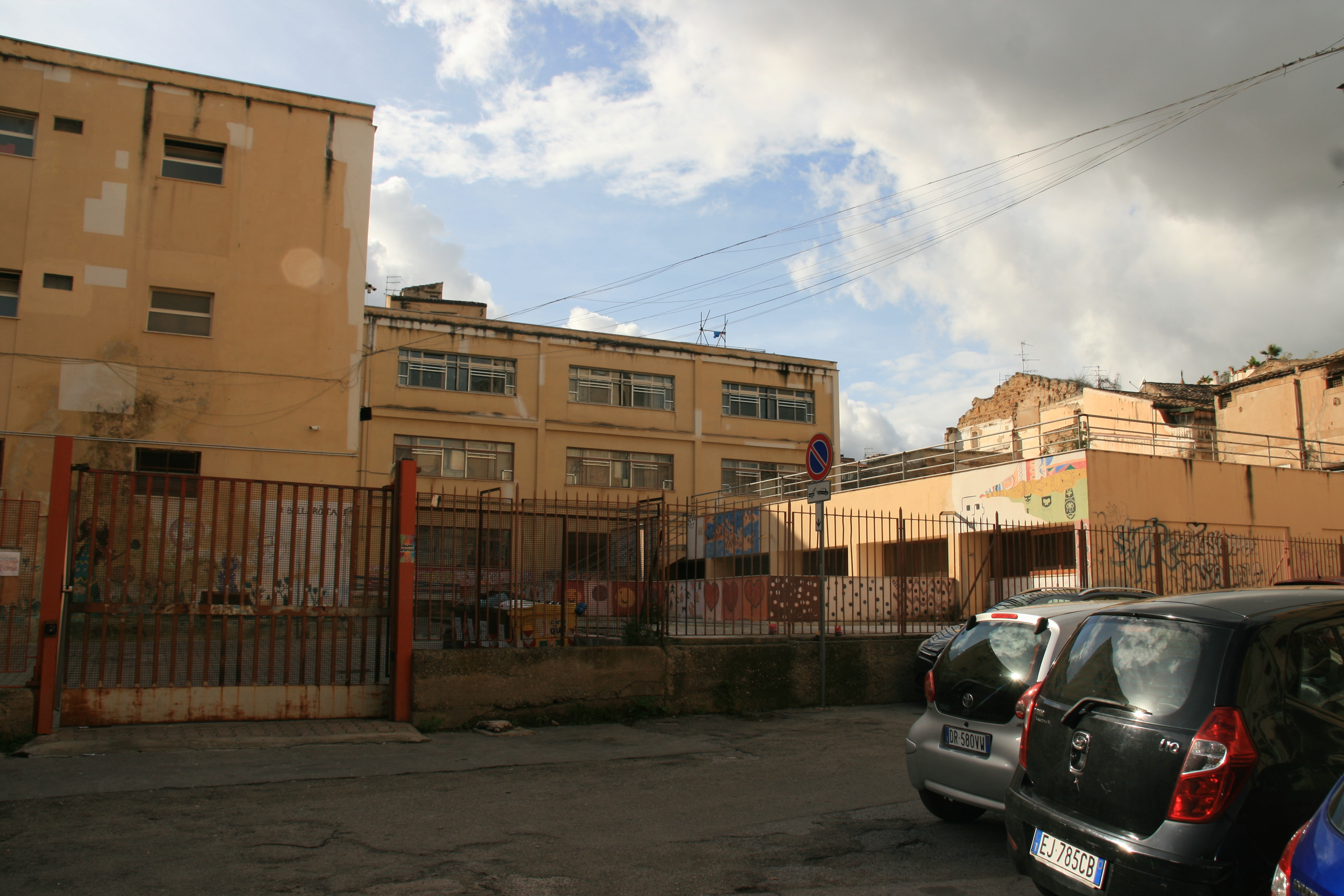Hier ein Schulgebäude in Palermo. Das sieht von außen wie eine Justizvollzugsanstalt aus. Auch die Optik des Gebäudes ist nicht sehr schön. Dem Schulhof nach zu urteilen, handelt es sich nicht um eine Grundschule, da keine Spielgeräte vorhanden sind.