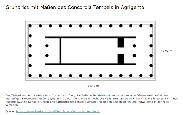 Die Griechen besiedelten Sizilien schon im fünften Jahrhundert vor Christi und haben monumentale Bauwerke hinterlassen (hier in Agrigento). Einige davon sind nach schweren Erdbebenschäden wieder errichtet worden. Wenn ihr euch den Grundriss des Concordia Tempels anschaut, hatten die ollen Griechen doch seltsamen Maße für ihre Bauten. Hatten die vielleicht andere Längenmaßeinheiten als wir? Recherchiert das einmal. Welche Maßeinheiten hatten die Menschen in früheren Zeiten und woran haben sie sich orientiert?