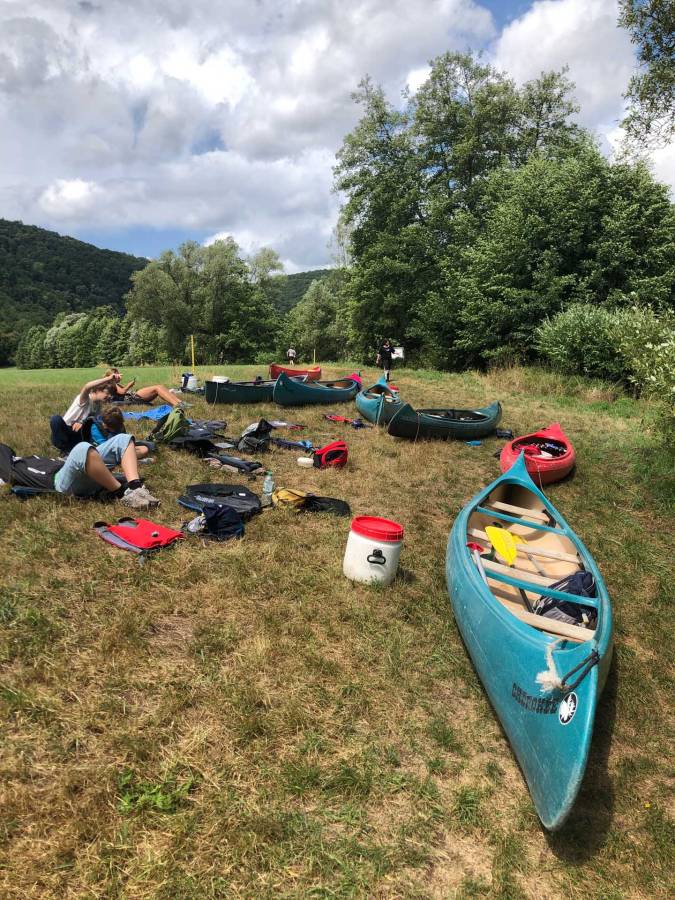 Später wurde es wieder sonnig und wir sind zur Saale gelaufen um Kanu zu fahren. Dann haben wir uns in Gruppen aufgeteilt und sind bis Wolfsmünster gefahren. Wir haben einen Greifvogel und einen Biber gesehen. Als wir angekommen sind, haben wir die Kanus dort am Sportplatz liegen gelassen und sind wieder zurück zum McKamp laufen. Dort haben ein Paar das Abendessen gemacht und der Rest ist in der Saale schwimmen gegangen. Zum Abendessen gab es Falafel, Ragout und Kartoffeln gegessen. Anschließend durften wir noch ein bisschen spielen und sind dann schnell ins Bett gegangen.